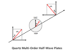 石英二分之一波片常用于旋转线偏振光的偏振方向,且不改变线偏振光的光强。相较零级二分之一波片,光经过多级二分之一波片时额外有m个全波长的相位延迟。未安装多级波片带切边,切边方向平行于快轴方向。