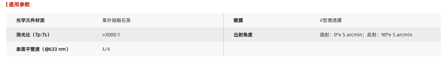 405 nm、532 nm、633 nm、780 nm、808 nm、830 nm、850 nm、1030 nm、1064 nm和1550 nm 10种设计波长可选。偏振分束立方顶部带黑圆点的棱镜表示其斜面镀有电介质偏振分光膜,电介质分光膜可以反射S偏振光和透过P偏振光。四周都可以作为入射面且分离出P偏振光和S偏振光,为达到最佳偏振性能,建议入射光从镀有偏振分光膜的棱镜的直角边入射。