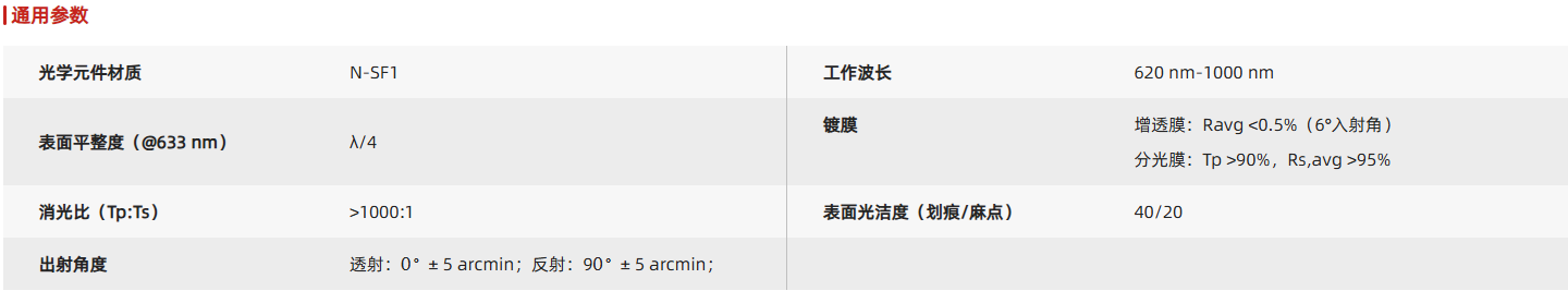 5 mm、10 mm、12.7 mm、20 mm和25.4 mm五种尺寸的偏振分束立方,其中25.4 mm分束立方已安装于同轴立方体外壳中,方便用户直接使用。立方体四周都可以作为入射面且分离出P偏振光和S偏振光,为达到最佳偏振性能,建议入射光从镀有偏振分光膜的棱镜的直角边入射,透过P光,反射S光。