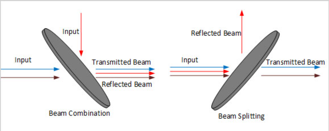 多波段二向色镜具有两个透射波段和一个反射波段。我们的多波段二向色镜的截止波长为740nm,起始波长为940nm,在480-710 nm和1000-1700 nm的波长范围内平均透射率大于90%,在753-935 nm范围内平均反射率大于95%。二向色镜一个表面镀有滤光膜,另一面镀有增透膜,箭头指向镀滤光膜表面。