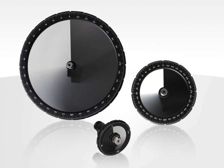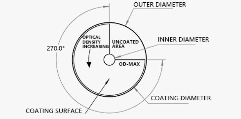 带安装的连续型中性密度滤光片的机械外壳具有角刻度和旋转轴,安装座经过精密设计,尽可能减小对光学元件通光孔径的影响。连续型中性密度滤光片一面镀滤光膜(铬镍铁合金膜),一面镀增透膜(A膜)。带刻度的一面为滤光膜面,为保证最佳性能,建议从此面入射。尽管属于反射型中性密度滤光片,铬镍铁合金膜仍会吸收部分入射光。同时,这种无保护层的金属膜要注意防止接触,清洁时建议使用气吹。