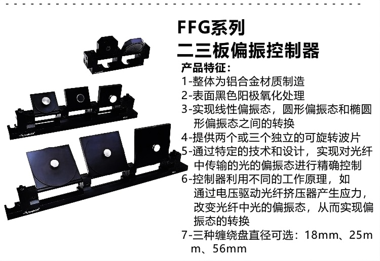 1-整体为铝合金材质制造 2-表面黑色阳极氧化处理 3-实现线性偏振态,圆形偏振态和椭圆形偏振态之间的转换 4-提供两个或三个独立的可旋转波片 5-通过特定的技术和设计,突实现对光纤中传输的光的偏振态进行精确控制 6-控制器利用不同的工作原理,如通过电压驱动光纤挤压器产生应力,改变光纤中光的偏振态,从而实现偏振态的转换 7-三种缠绕盘直径可选:18mm、25m m、56mm